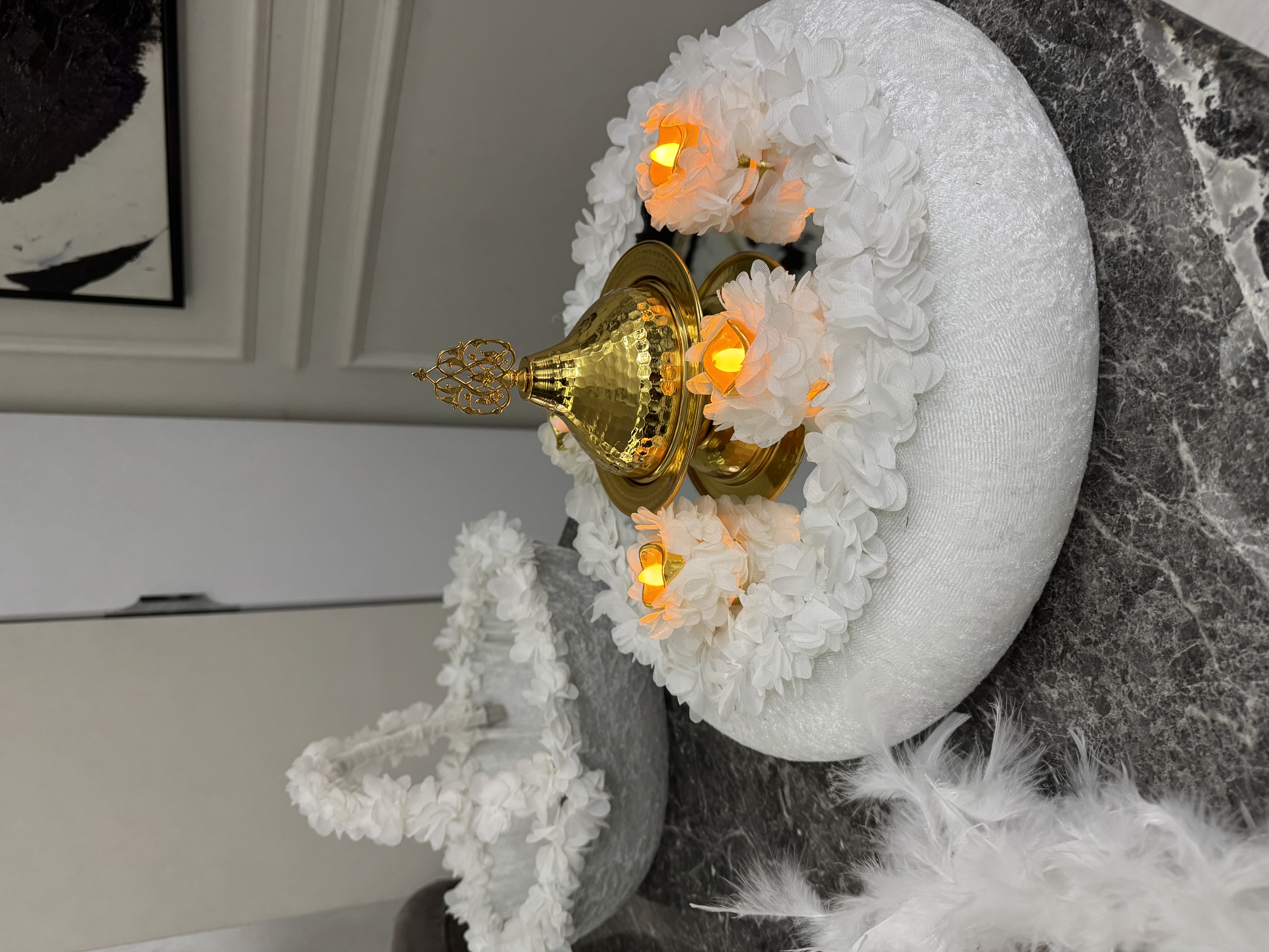 Kına gecelerinde kullanılan yöresel beyaz kına seti, saflığın ve zarafetin simgesi olarak öne çıkar. Genellikle işlemeli kına tepsisi, şık kına mumları, özel tasarım örtüler ve aksesuarlarla birlikte sunulan bu setler, gecenin atmosferini tamamen değiştirir. Özellikle büyük organizasyonlarda, bu setlerin görselliği büyük önem taşır.